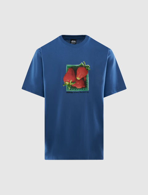 The Berries Tee by Stüssy offers soft cotton comfort with a ribbed crewneck and relaxed fit. Its bold screen-printed strawberries graphic adds a stylish edge to your casuals.