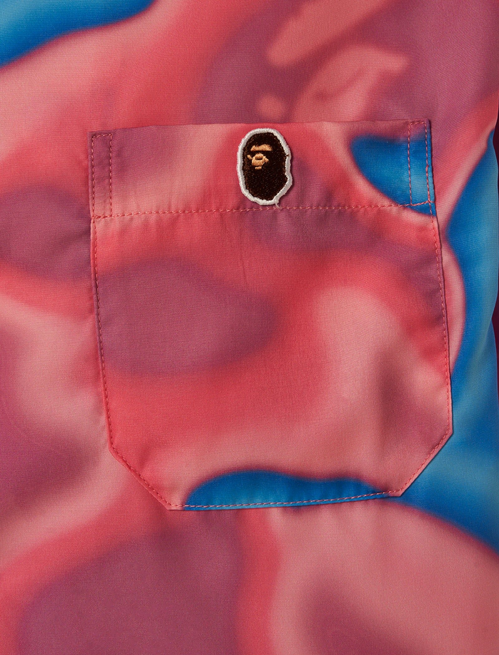 Make a statement this summer with the Camo Collar Shirt. Featuring a bold, vibrant liquid camo print and an embroidered ape, this button-up is a must-have for a fresh and stylish look.