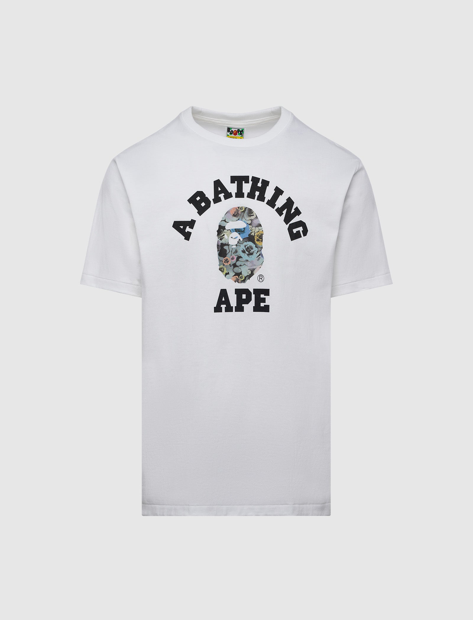 Elevate your style with A Bathing Ape's Floral Camo Tee, featuring the iconic logo text alongside a floral ape graphic on the front for a unique, eye-catching design.