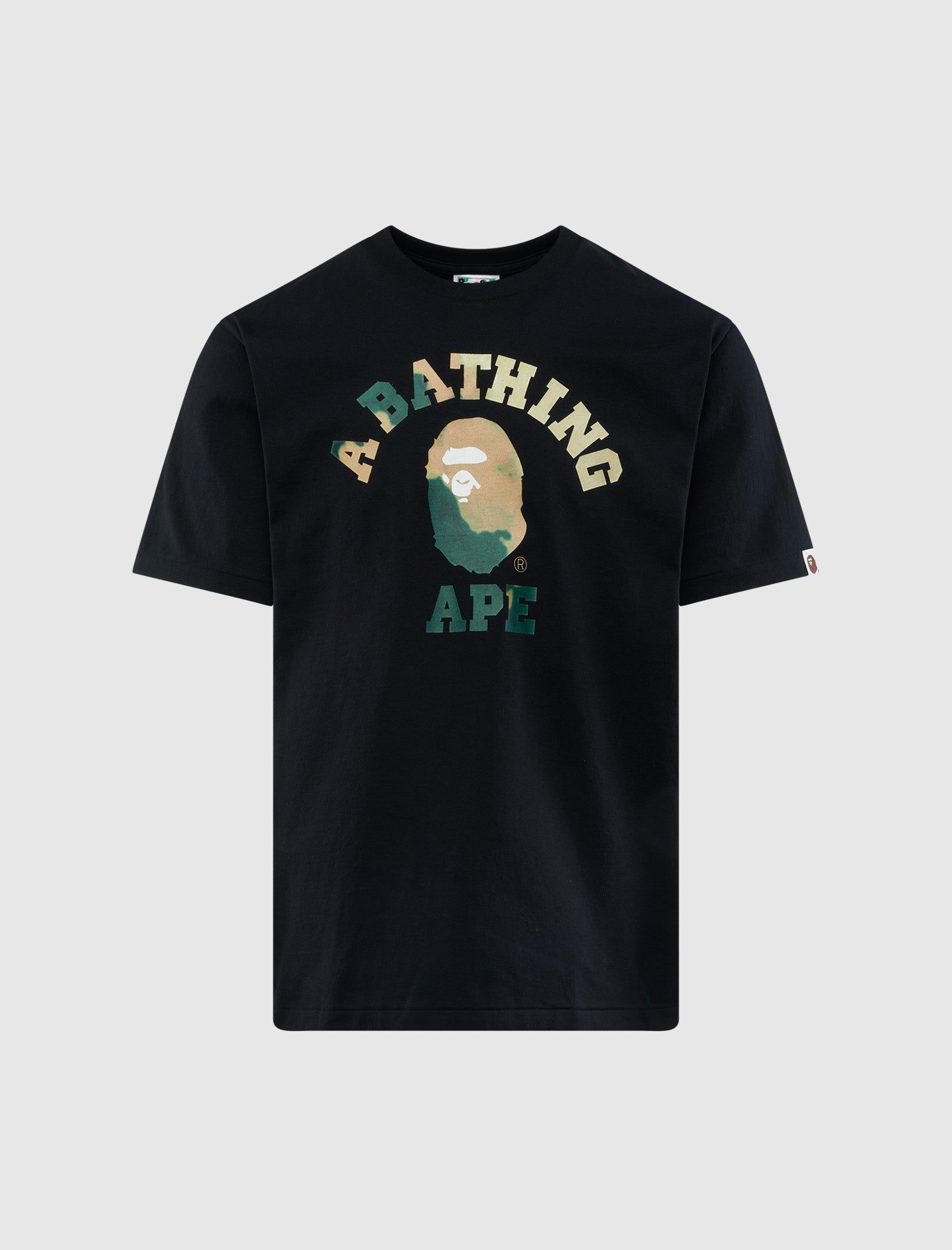 A Bathing Ape's Tie Dye College Tee features the classic logo and ape print with a vibrant tie dye design for a bold, stylish look.