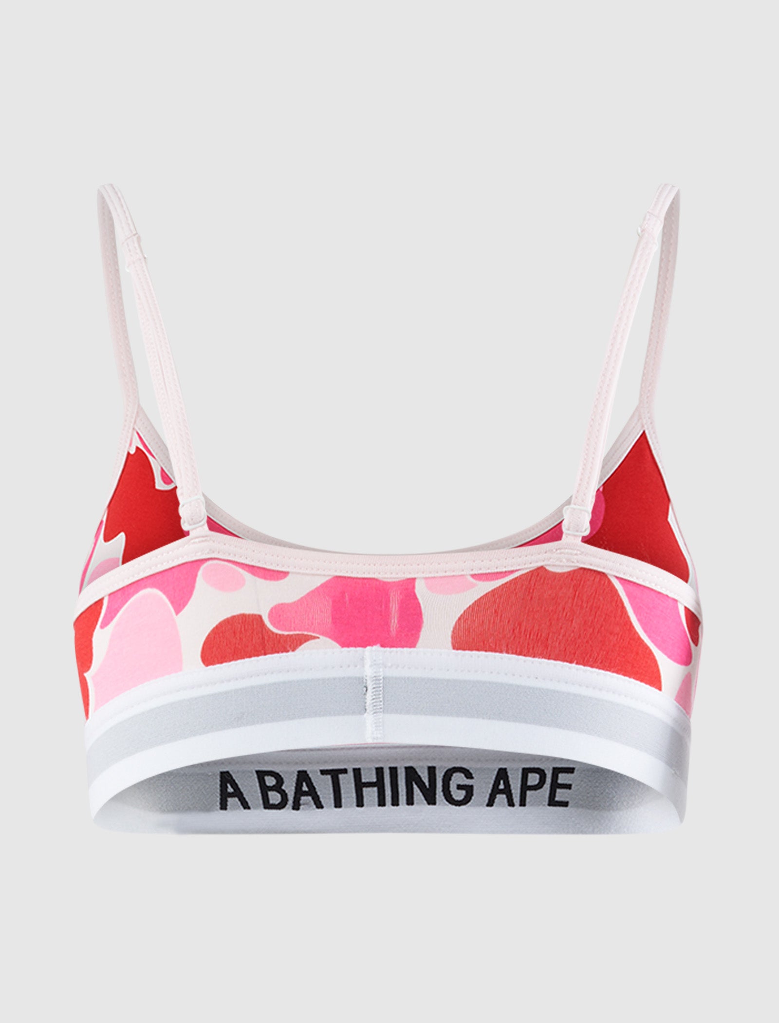 Stay confident and comfortable with A Bathing Ape's Women's Sports Bra, showcasing a bold camo print and a branded logo band for a sleek, supportive fit.