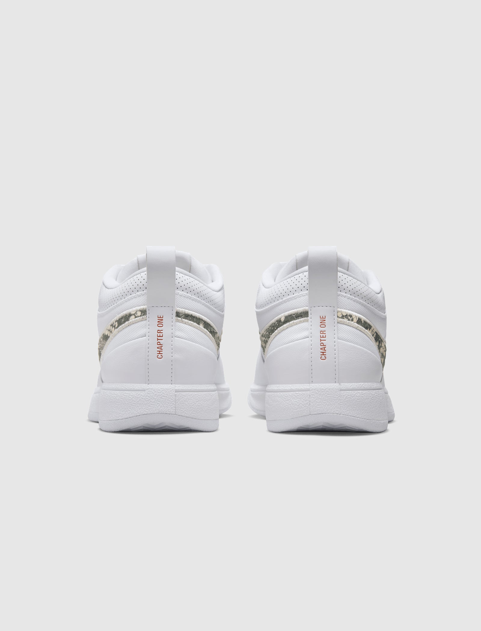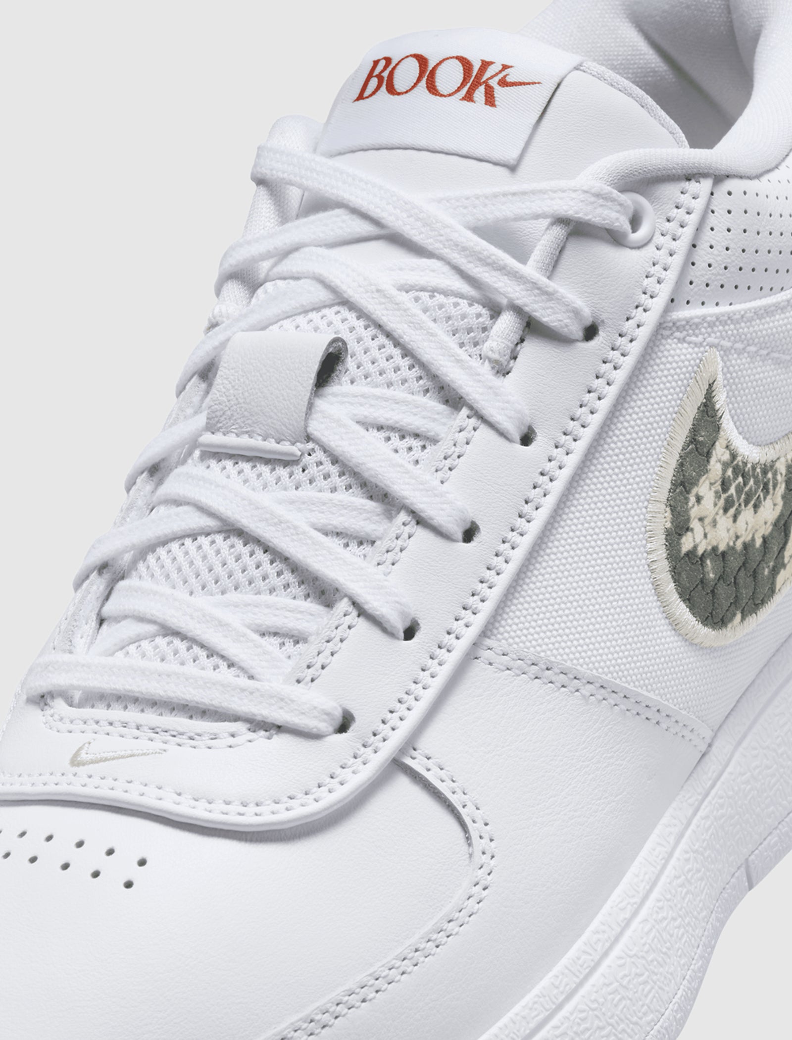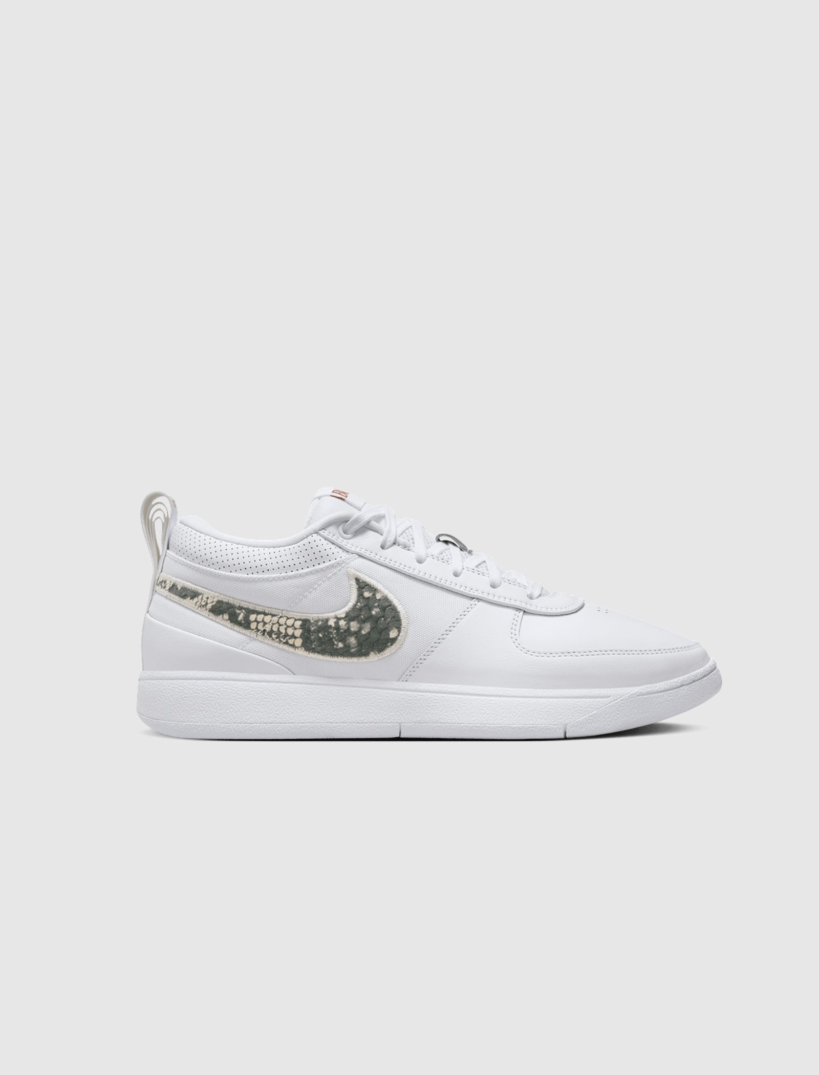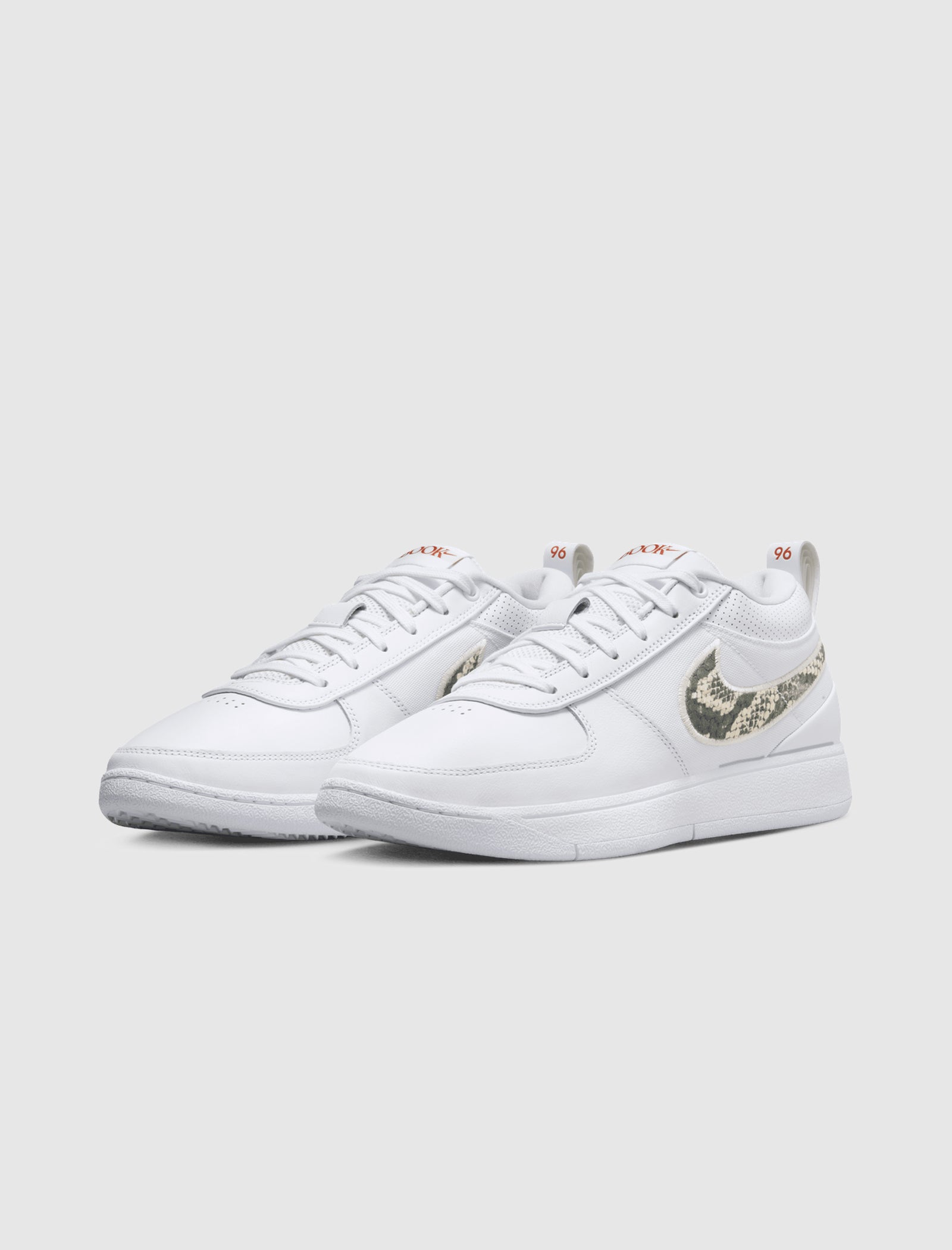 Low-top sneakers. Leather upper. Leather overlays on the toe, around the toe box, and heel counter. Canvas side panels. Perforated leather collar. Synthetic mesh and leather padded tongue with a polyester tag stitched at the top. Front lacing. Textured textile logo-motif shaped patches are embroidered on the side panels. Layered loop pulls on the heel with a stamped "96" numbering. Composite foam midsole. Translucent rubber outsole.