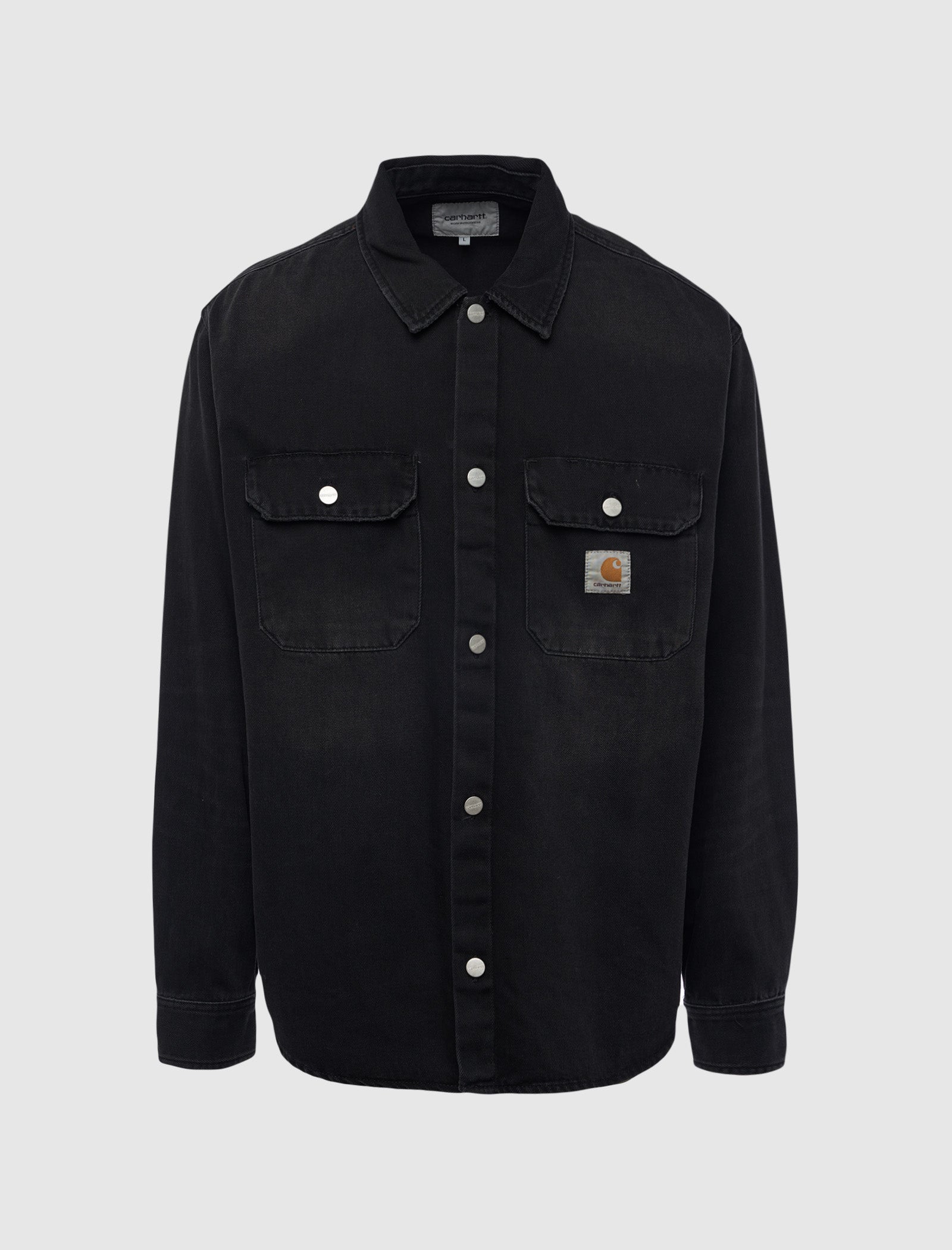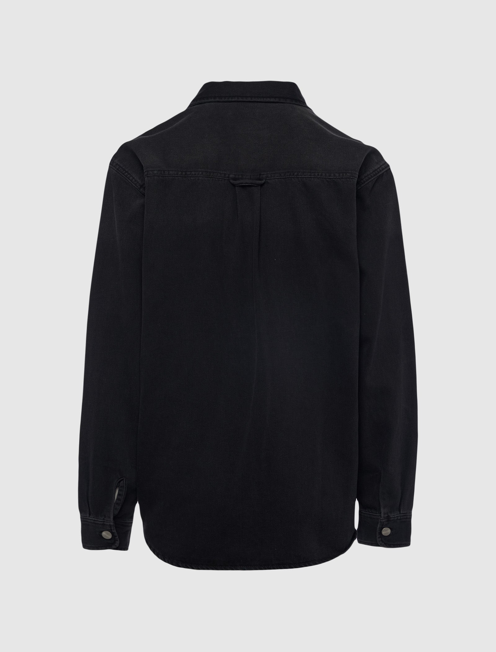 Relaxed-fit dark washed denim shirt. Classic collar. Two patch pockets featuring woven brand label at chest. Snap button cuffs. Silver-tone hardware. Snap closures at center front.