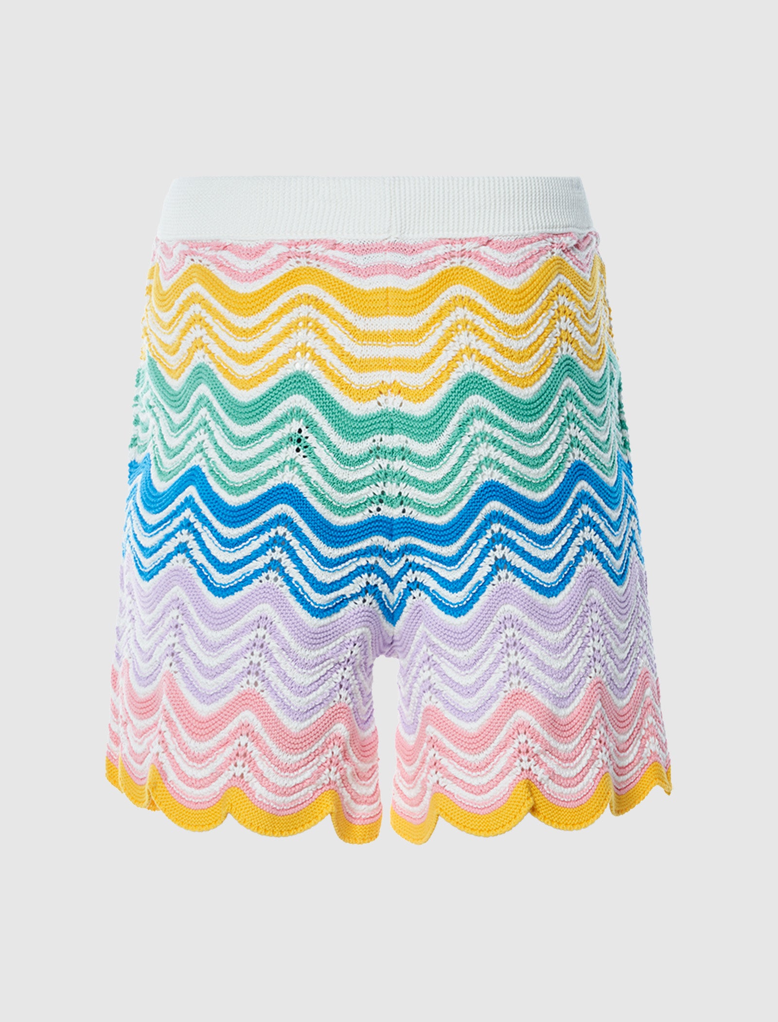 Regular-fit multicolor wave knit shorts. Elasticized drawstring waistband. Logo patch above hem.