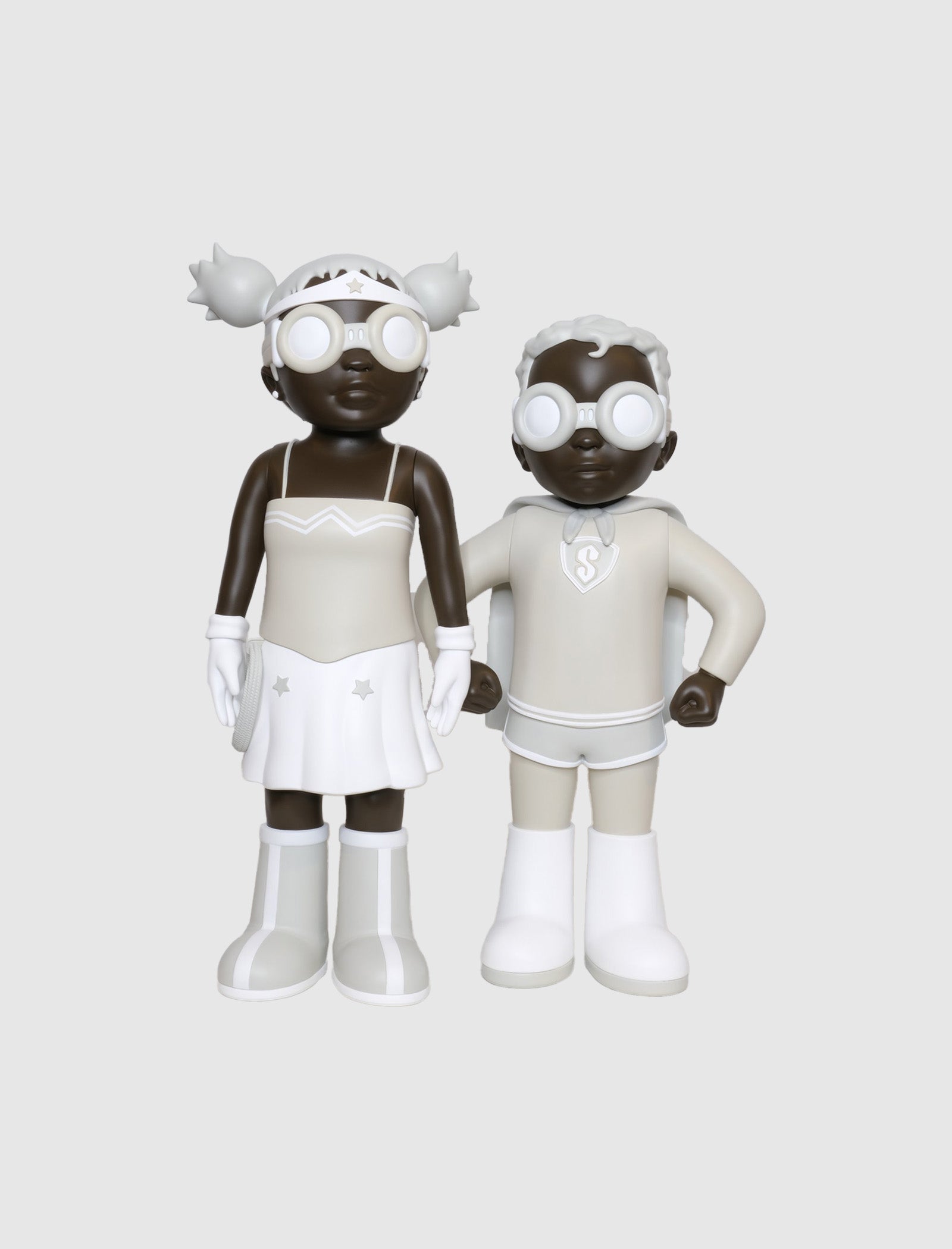The Power Duo '98 Vinyl Collectible Set by Hebru Brantley includes two unique figures, LIL WONDA (17") and SUPA (15.5"). Limited to 150 sets worldwide, it’s a must-have for collectors and urban art fans.