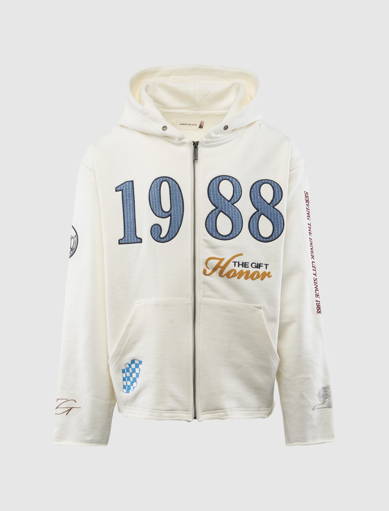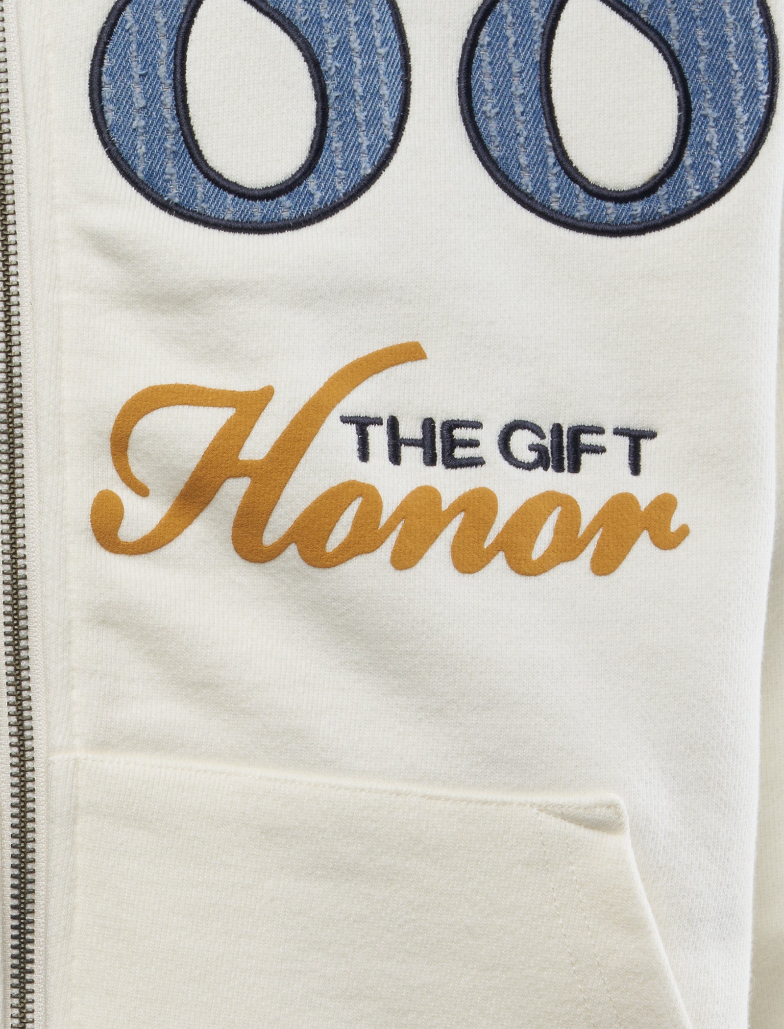 Honor The Gift’s heavyweight hoodie features a classic fit, bold graphics, rhinestone sleeve detail, kangaroo pockets, and a front zip for easy wear.