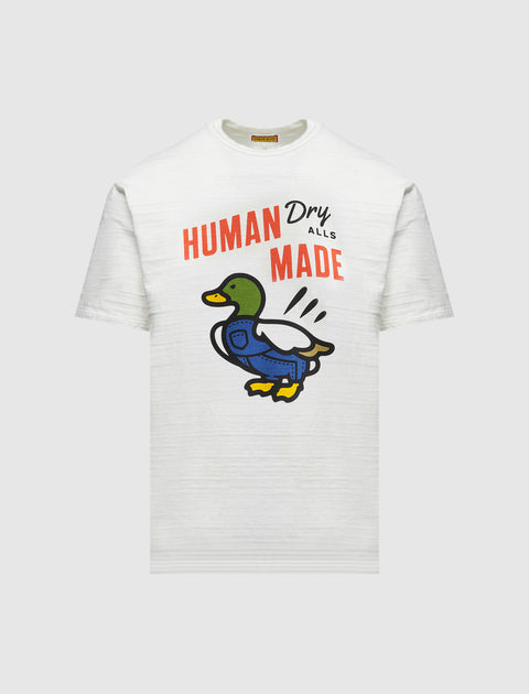Classic-fit short sleeve cotton t-shirt. Ribbed crewneck. Graphic logo text featuring duck overall print at front. Graphic logo print at back.