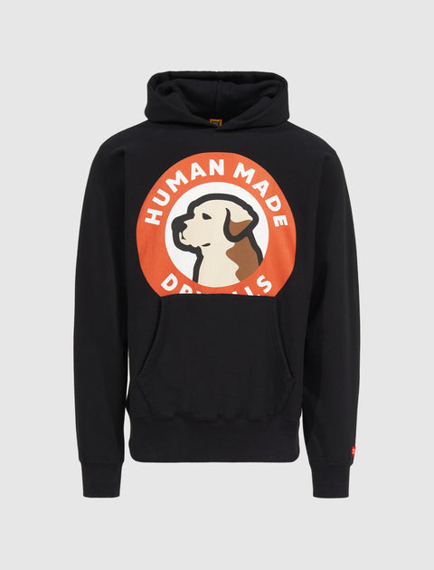 Pullover cotton hoodie. Fixed hood. Graphic print and logo text at chest. Kangaroo pocket at front. Ribbed cuffs and hem.