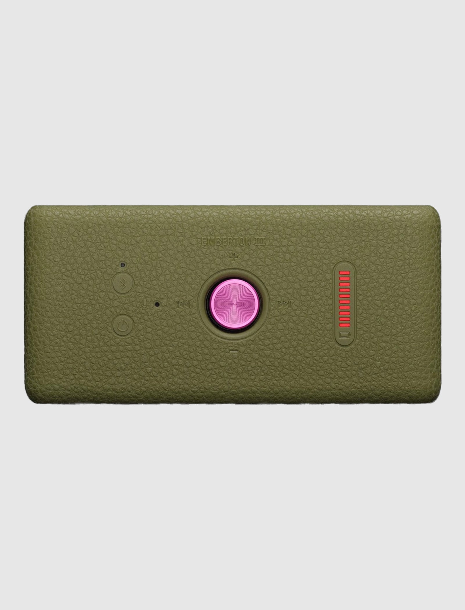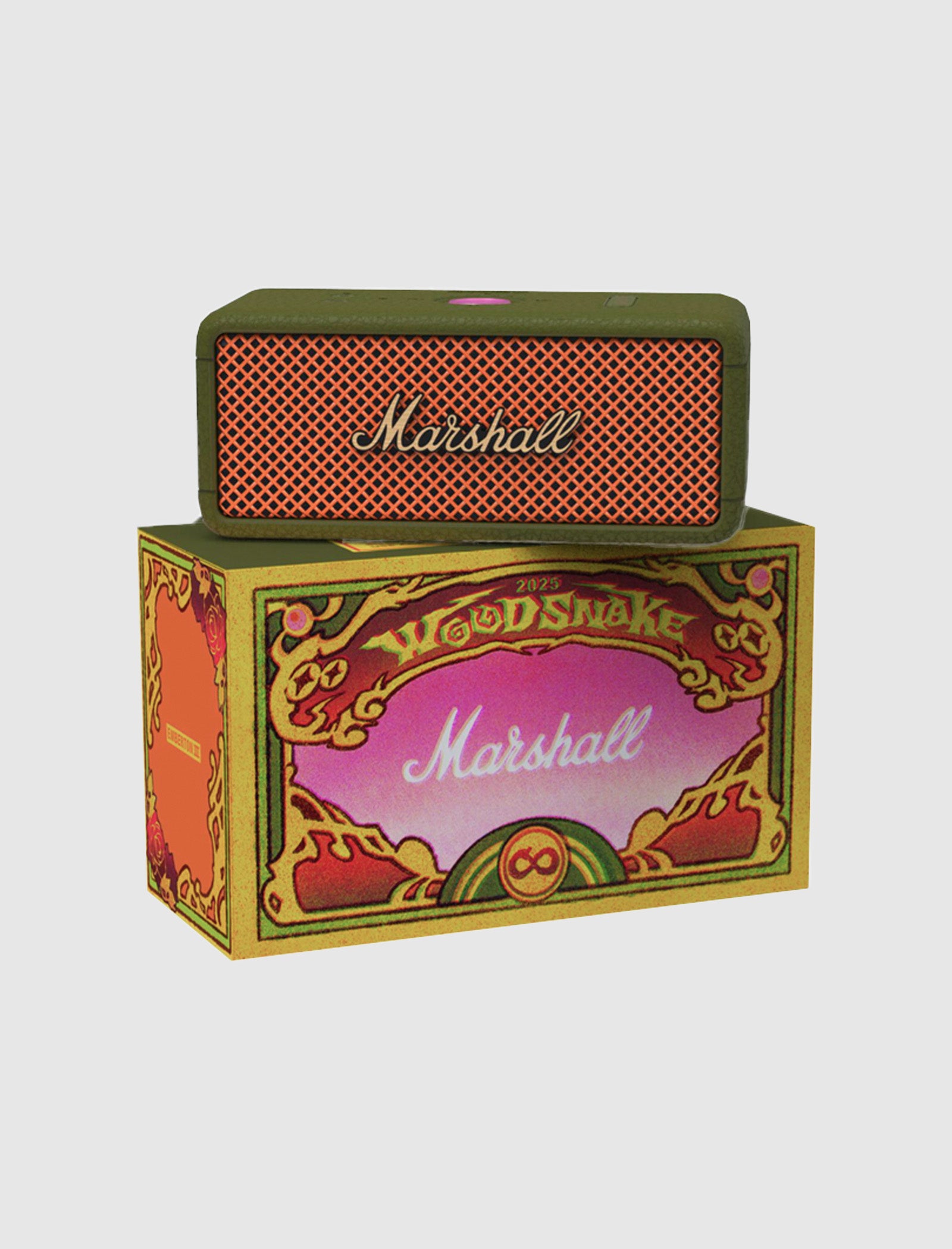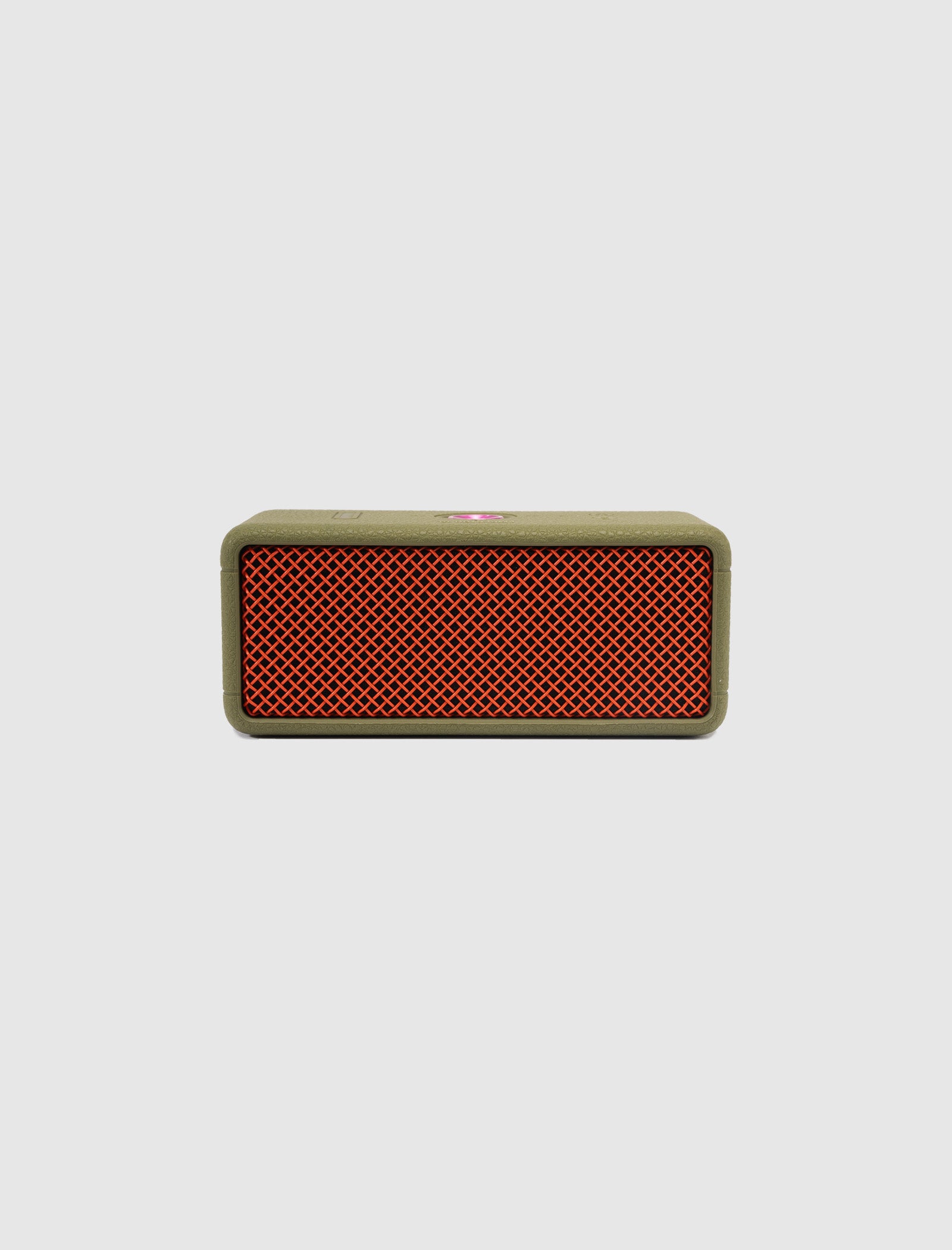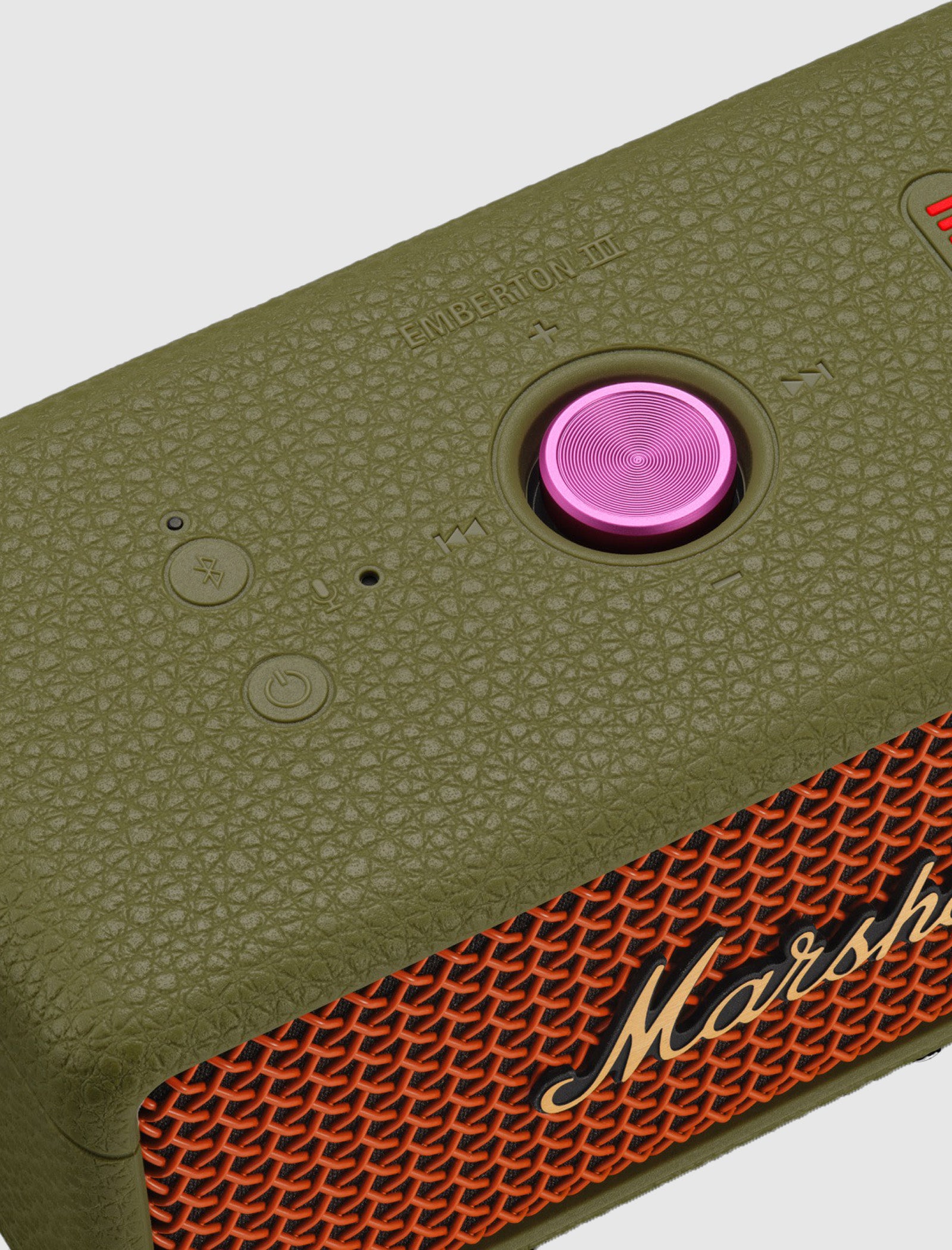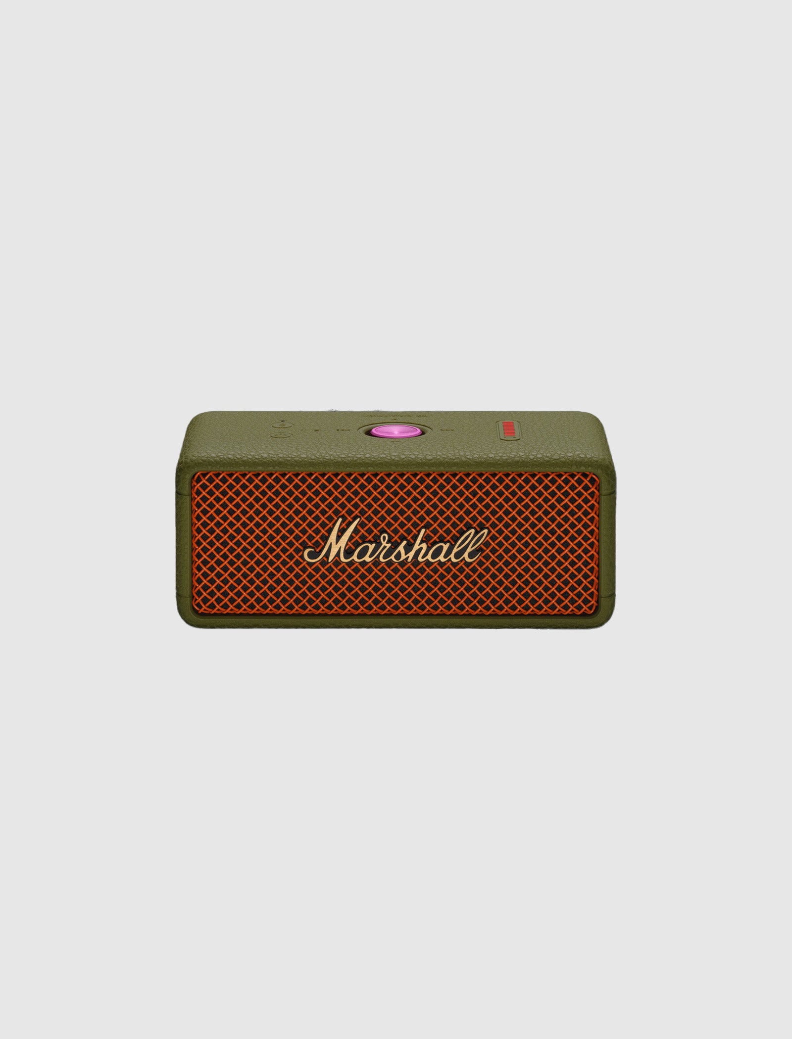 Leather texture portable bluetooth speaker. Grille at front and back featuring brass logo text at front. True Stereophonic 360 sound with 32+ hours of playtime and quick charge. Built in microphone. Compatible with Marshall Bluetooth app