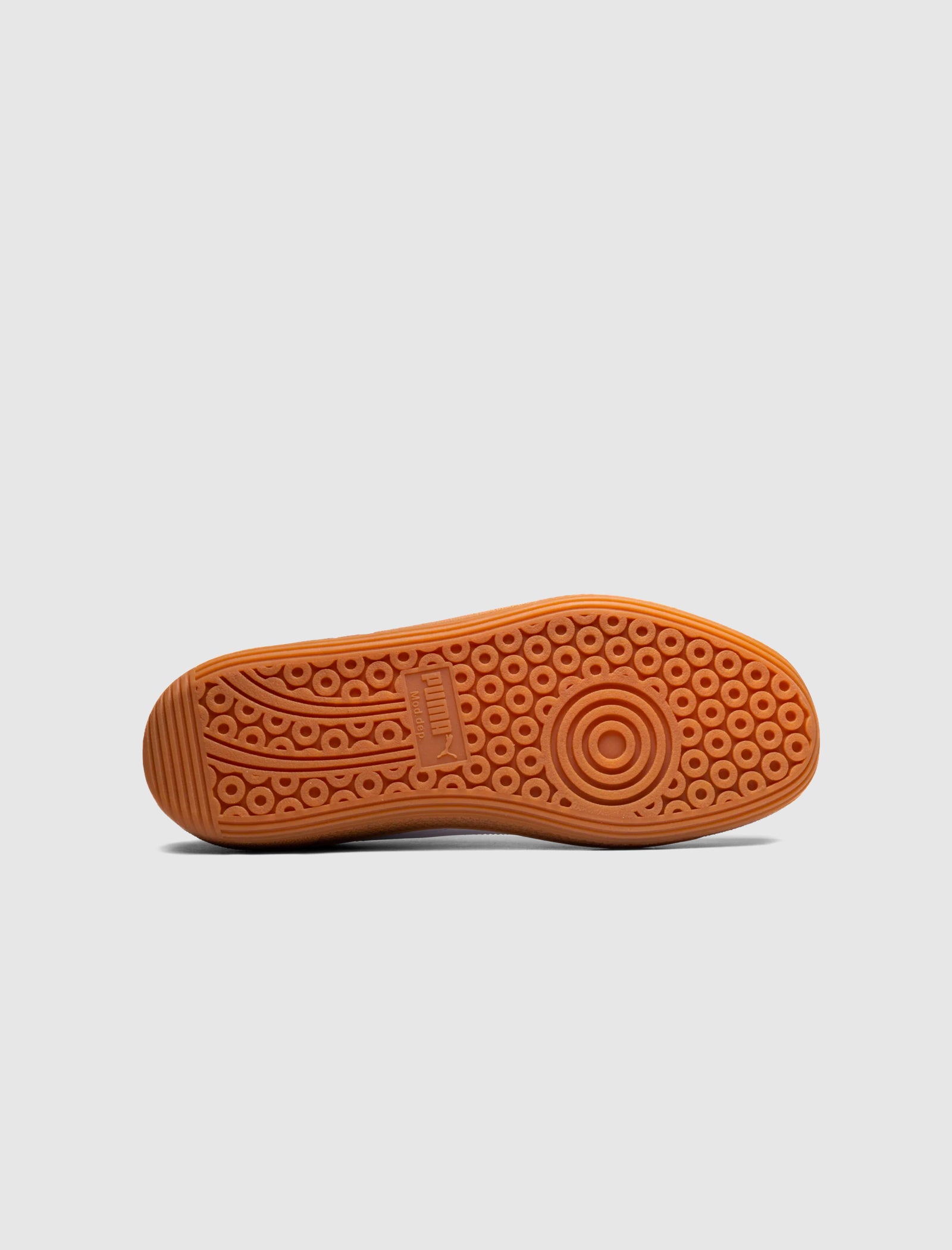 Low top sneakers. Leather upper. Suede overlays around the toe, eyelet panels, and heel counter. Front lacing. Suede tongue. Suede tag attached on the outer side panel witha. gold logo stamp. Leather logo-shaped patches stitched on the side panels. Cutout leather accent on the heel with a gold stamped logo. Gum midsole, and outsole.