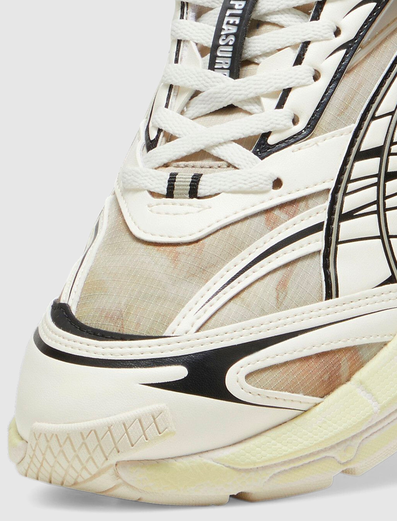 Low top sneakers. Mesh underlay throughout the upper. Synthetic textile overlays around the toe, eyelet panels, side panels, and heel counter. Synthetic textile logo patches stitched on the side panels with graphic print. Mesh tongue with a synthetic textile patch at the top. Front lacing. EVA foam midsole Rubber outsole. Overdyed all throughout.