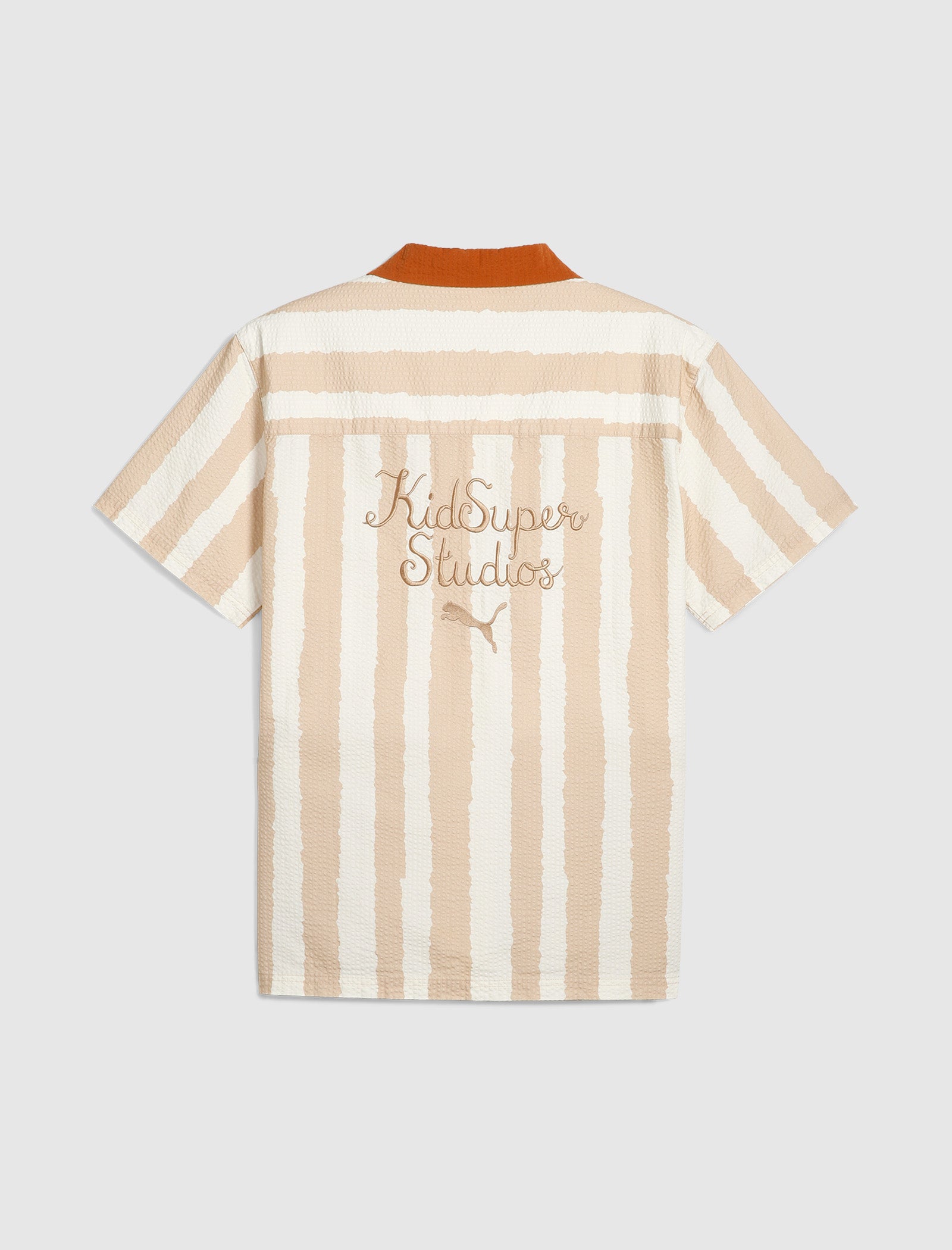 Puma x KidSuper woven shirt brings artistic flair with vibrant prints, lightweight breathable fabric, and relaxed fit—perfect for creative layering and playful, standout style.