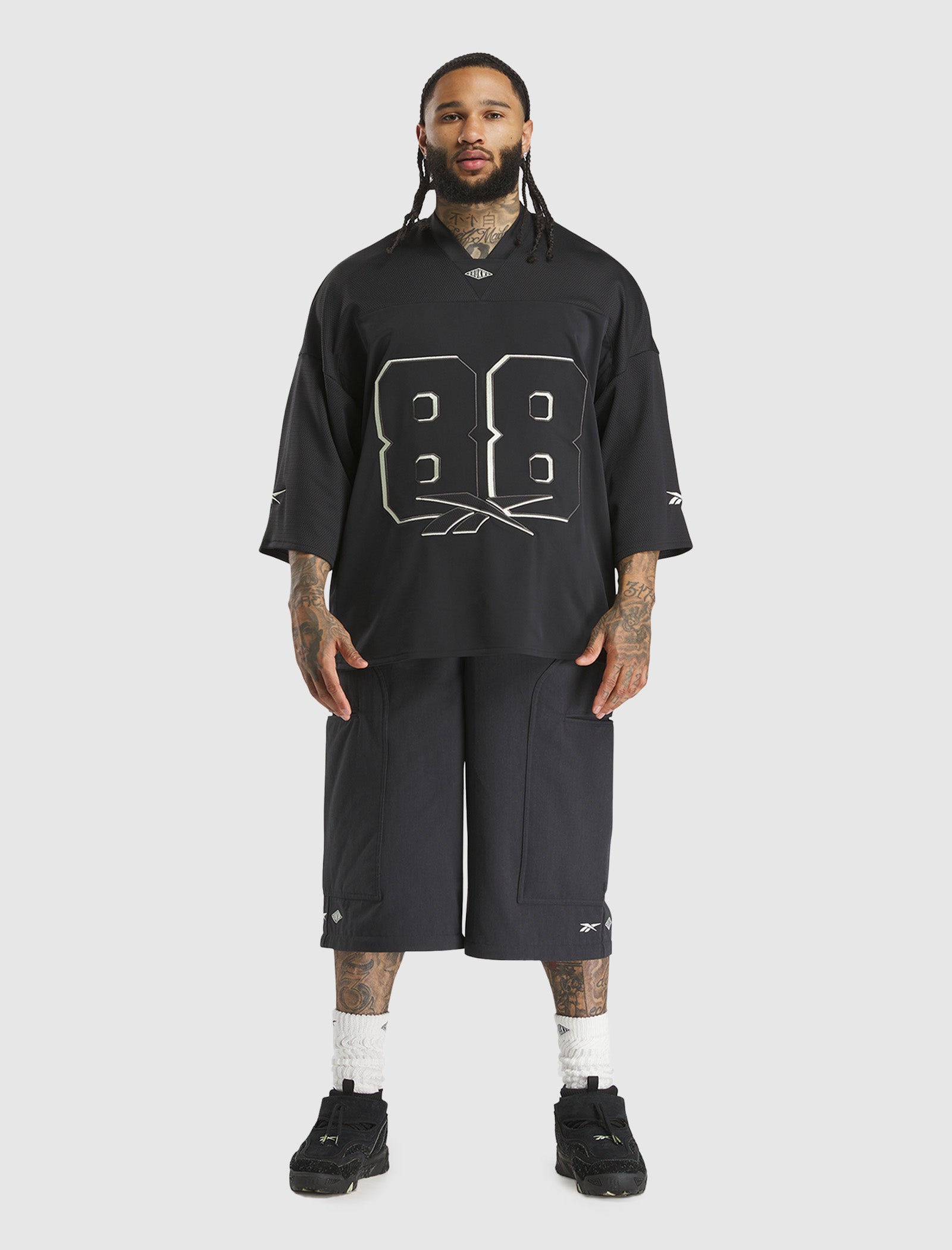 Oversized-fit short sleeve jersey. V-neck. Performance mock eyelet paneling throughout. Satin stitched embroidered logo print at front, sleeves, and back. Appliqué numbers at front and back. Embroidered name plate graphic text at back. Notched hem detailing.