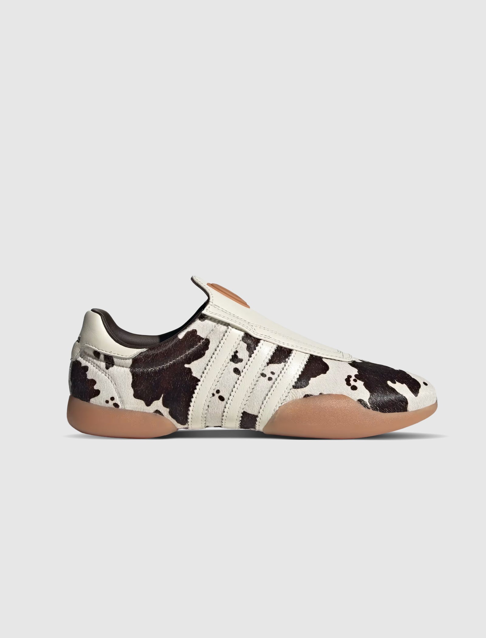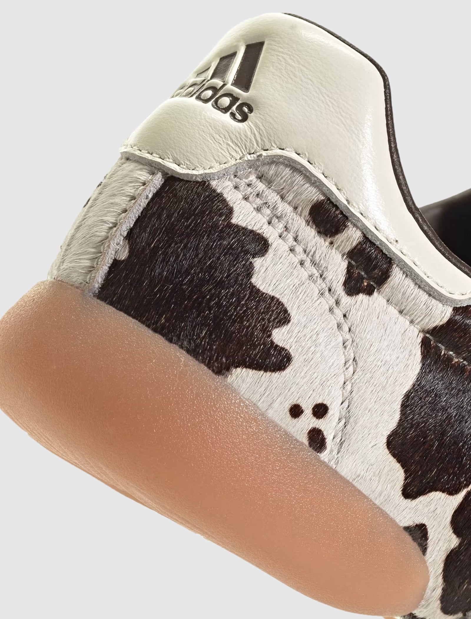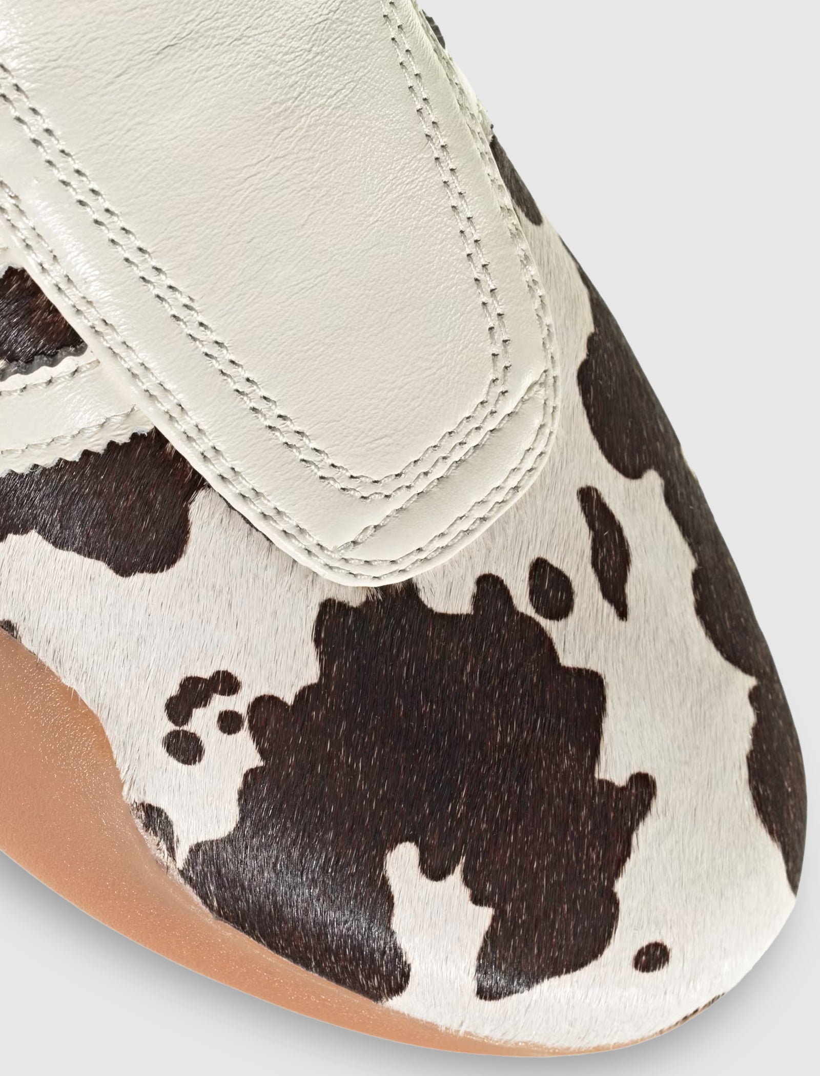 Low top sneakers. Calf-hair upper. Leather front panel, and leather panel on the back of the collar. Stamped logo on the back of the collar. Leather stripe motif patches stitched on the side panels. Low profile rubber outsole.